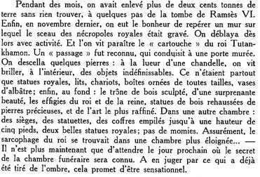 (…)Aussitôt s’organisait, à l’insu du Public gobeur et moutonnier, une réclame adroite savamment dosée. Chaque matin les journaux anglais publiaient, en manchette, la découverte sensationnelle (une par jour) : coffre, canne, tabouret, mannequin, gant même, avec, dans le texte explicatif, un luxe de descriptions, de poésie, d’évocations, incitant les moins curieux des « buss-ness-men » à aller dans la Vallée des Rois; se rendre compte par eux-mêmes des merveilles qu’ils y pourraient voir exhumer !
