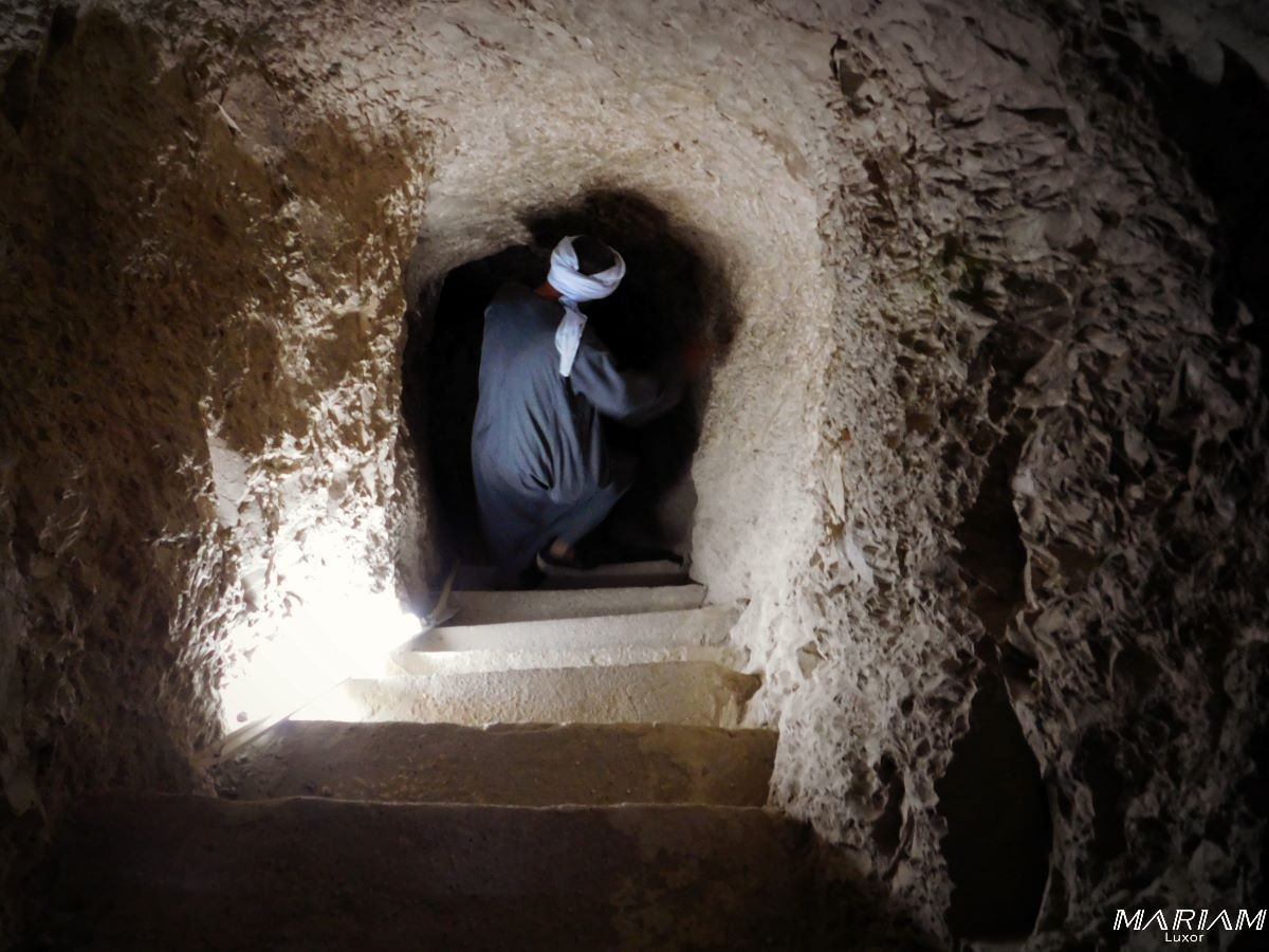Accéder à la tombe de Sennefer est une véritable aventure en soi. Il faut tout d’abord gravir les pentes de la nécropole (offrant une vue extraordinaire sur la vallée et le Ramesseum) pour ensuite s’enfoncer sous terre. Un escalier courbe de 44 marches, grossièrement taillées, conduit à une galerie basse de plafond de 12 mètres sous terre. On se retrouve soudainement dans la peau d’un explorateur du 19ème siècle.
